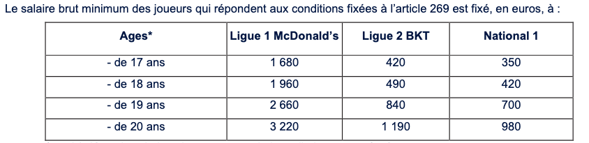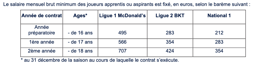 Les rémunérations minimum des contrats apprentis et aspirants dépendent de l’âge du joueur ainsi que du niveau auquel évolue l’équipe première du club professionnel.