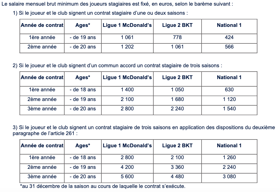 Le contrat stagiaire ouvre droit à une rémunération minimum évolutive en fonction de l’âge et du niveau du club.